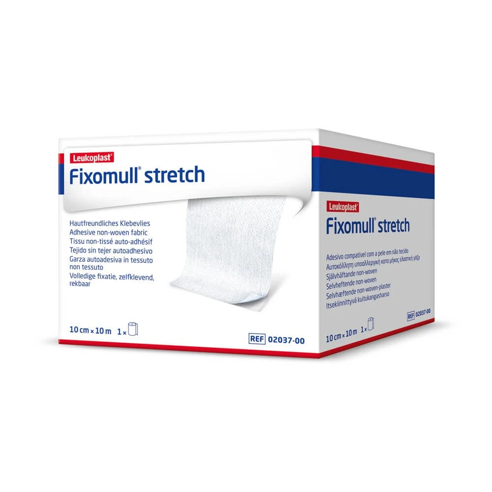 Fixomull Stretch is a wide area adhesive tape which is especially suitable for use on frequently mobile and highly contoured parts of the body. It is made from white, stretchable, non-woven polyester dressing sheet coated with skin-friendly polyacrylate adhesive on quick-release backing paper. The adhesive ensures the dressing is firmly secured on all sides and cannot slip or become detached.