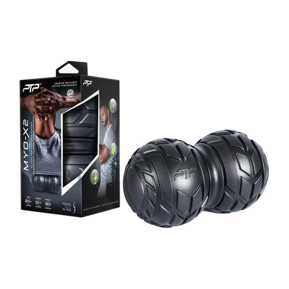 Offering a convenient deep tissue massage, the PTP Myo-X2 is specifically designed for use on the back. The recessed mid-section accommodates the spinal joints, making it ideal to roll out the muscles along both sides of the vertebral column (bilateral symmetry). The ergonomic morphology can also prove useful to simultaneously target the right and left sides of muscles, such as the biceps, triceps, hamstrings, quadriceps and calves.